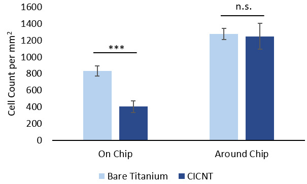 Limitations of the current study include the short timeframe of the experiment (24 hours). Longer amounts of time could allow for more cellular attachment and growth, or the opposite could occur. Future work will investigate the response of human osteoblasts to the CICNT surface over a longer period of time. In addition, this experiment assessed only the number of viable cells present on each material, and future work will also assess cellular function and metabolism.